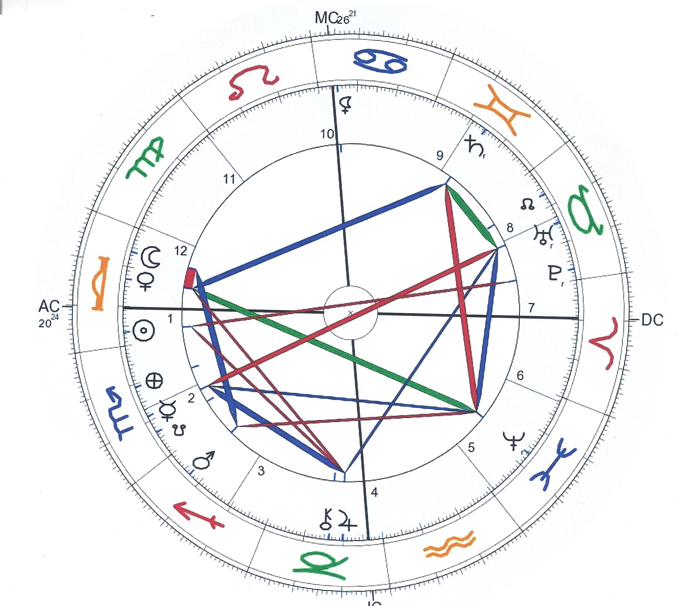 Ce thème est celui d’un poète qui a cheminé dans sa vie avec pour seule lanterne, un absolu incorruptible. Il est connu pour son intransigeance, ses choix sans concessions, sa liberté immense, portant en lui des aspirations bien plus vastes que la vie prosaïque ne peut lui en promettre. Le thème présente une personnalité solaire puisque le Soleil est conjoint à l’Ascendant, de plus il comporte trois planètes en Balance, dont Vénus dignifiée dans ce signe : C’est par son sens de la beauté, de l’harmonie, de l’équilibre que la personne va se distinguer, se différencier. Le Soleil est électrisé par une opposition à Pluton et un carré à Jupiter : là est l’intensité qui va colorer les choix de sa vie. Mars joue sa partie, en étant placé dans le signe de Jupiter, le Sagittaire : l’action est au service du voyage mental et terrestre, d’une forme personnelle de transcendance. Mars est sextile à la Lune : cette mise en mouvement martienne nourrit sa sensibilité et vice-versa. Mars carré à Neptune indique des élans, des projets hasardeux, produits des mirages et visions de son esprit. Jupiter en Capricorne est affaibli dans ce signe et enjoint de baser ses aspirations sur des structures fiables et réalistes. Il est toutefois en trigone à Uranus, ce qui lui donne toute sa dimension de visionnaire, de créateur à l’avant-garde.